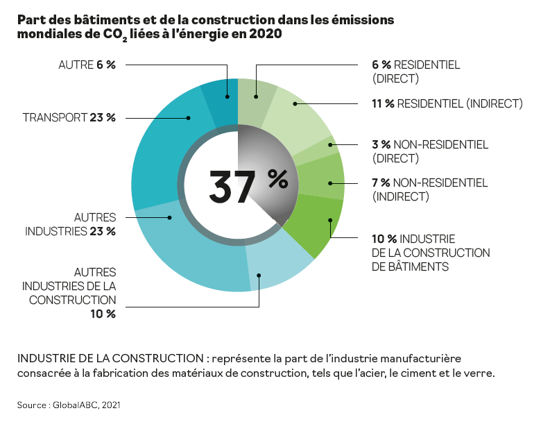 Le secteur de la construction est reconnu comme le 3e plus grand émetteur d’émissions de GES au monde. Selon un rapport du Programme des Nations unies pour l’environnement (PNUE), ce secteur totaliserait à lui seul 37 % des émissions mondiales de GES.